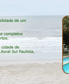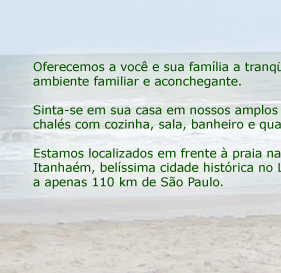 Oferecemos a você e sua família a tranqüilidade de um ambiente familiar e aconchegante. Sinta-se em sua casa em nossos amplos e completos chalés com cozinha, sala, banheiro e quartos. Estamos localizados na cidade de Itanhaém, belíssima cidade histórica no Litoral Sul Paulista, a apenas 110 km de São Paulo. Ambiente exclusivo para famílias Em frente à praia! Itanhaém - litoral Sul Paulista